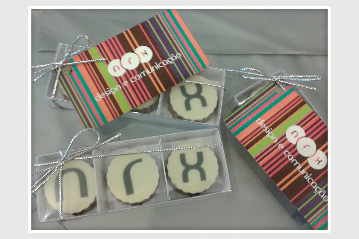 Caixa com 3 bombons de chocolate gourmet belga Barry Callebaut, personalizados com as letras da marca nrx.